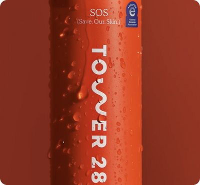 Tower 28 Beauty SOS Rescue Spray (4 oz) Tower 28 Beauty SOS Spray Duo featuring full-size (4oz) and travel-size (1oz). [Shared] Tower 28 Beauty SOS Rescue Spray in Refill size. [Refill] Tower 28 Beauty SOS Rescue Spray in 1oz. [1oz] Orange toner spray bottle with text on a red background [Shared]